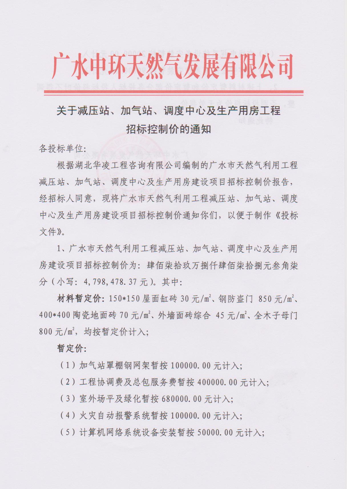 關(guān)于減壓站、加氣站、調(diào)度中心及生產(chǎn)用房工程招標(biāo)控制價(jià)的通知
